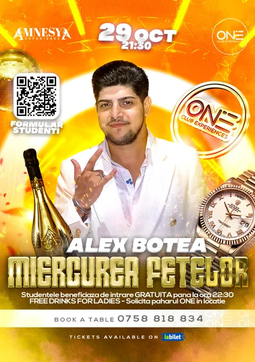 Pe 29 octombrie, de la ora 21:30, te așteptăm la One Club Experiences la o nouă ediție a conceptului „Miercurea Fetelor”, alături de Alex Botea.