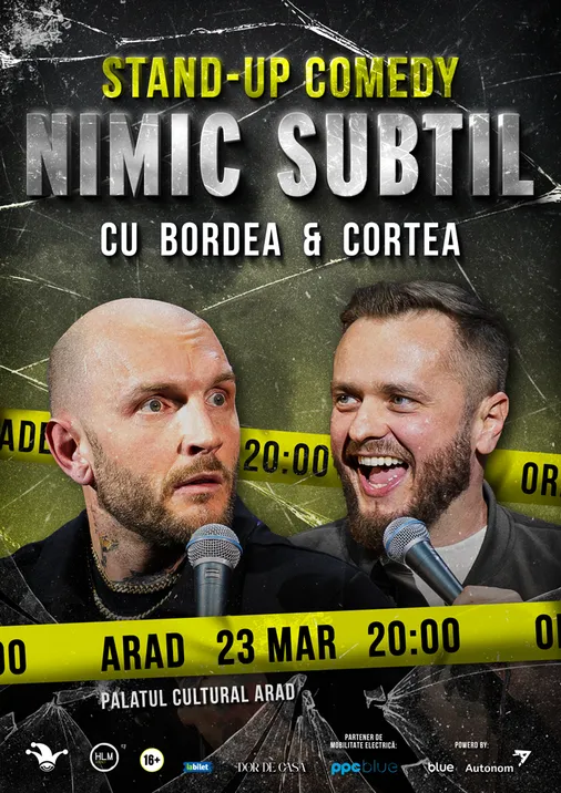 Cătălin Bordea și Nelu Cortea aleg calea directă în noul lor show de stand-up comedy - “Nimic subtil”. Și este exact ceea ce ai nevoie! Într-o lume care ne cere constant să fim cu perdea și să ne ascundem trăirile în spatele unui zâmbet politicos, Bordea și Cortea spun lucrurilor pe nume. Filtru? Nu există. Subtilitate? Zero. Glume? Din plin.