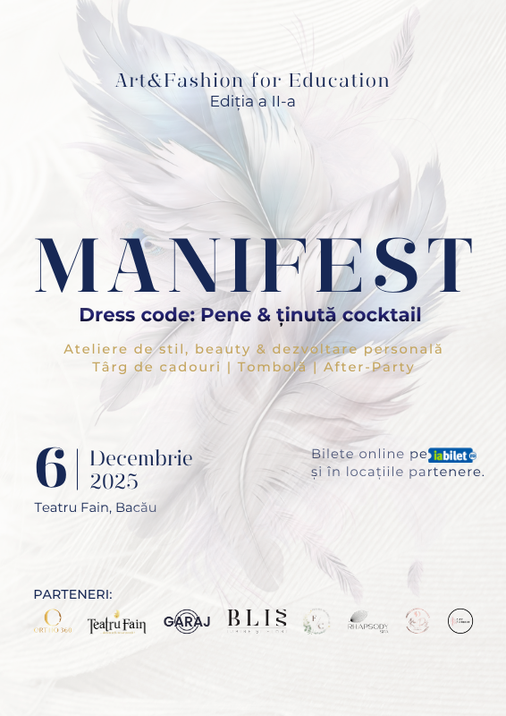După o primă ediție dedicată autenticității și eleganței, Art & Fashion for Education revine cu o nouă temă – MANIFEST. Pe 6 decembrie, Teatru Fain Bacău devine scena unde arta, moda și educația se împletesc într-un eveniment dedicat femeilor care aleg să se exprime liber, cu grație și încredere.