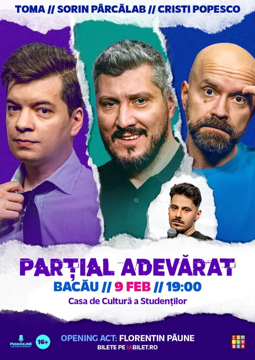 Îi știi de la televizor, de pe YouTube sau de la ComedyBox. I-ai văzut în Una Scurtă, Râzi că Prostu’ sau te-ai uitat la podcastul Ceva Mărunt, iar acum poți să-i vezi LIVE! Sorin Pârcălab, Cristi Popesco și Toma pleacă toamna asta în turneu cu material nou, glume noi și povești care te vor face să râzi în hohote! Hai să-i vezi și tu în cel mai nou show al lor: Parțial Adevărat! Locurile sunt limitate, așa că ia-ți biletele din timp și asigură-ți locul la cel mai așteptat show de Stand-up Comedy al toamnei!