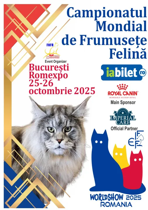 Campionatul Mondial de Frumusețe Felină 2025 are loc pe 25–26 octombrie la Romexpo, Pavilionul Central, și aduce împreună cele mai frumoase pisici din lume.