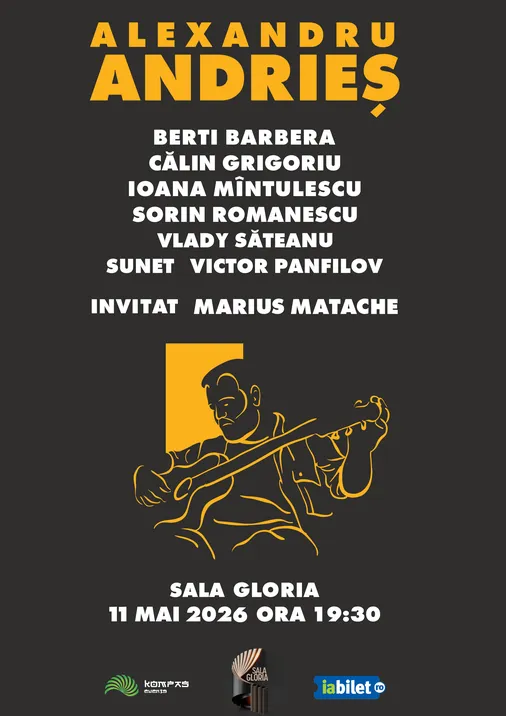 Alexandru Andrieș și prietenii vă așteaptă luni 11 mai 2026 la Sala Gloria din București; în deschiderea concertului va cânta Marius Matache.