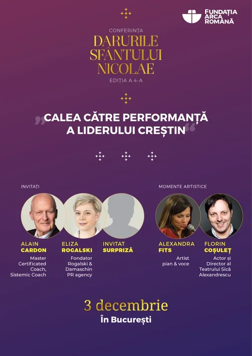 Te invităm la "Conferința și Cina Darurile Sfântului Nicolae’’, cea de-a patra ediție a Conferințelor ARCA - o seară de lumină, comuniune și inspirație între oameni care cred că performanța nu exclude sufletul.