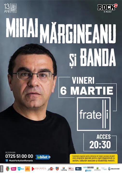Campania "Music for Autism" te invită vineri, 6 martie 2026, acces ora 20.30 în Club Fratelli Constanța la un eveniment deosebit atât prin scopul lui, cât și prin prezența unor artiști de valoare - Mihai Mărgineanu și Banda.
