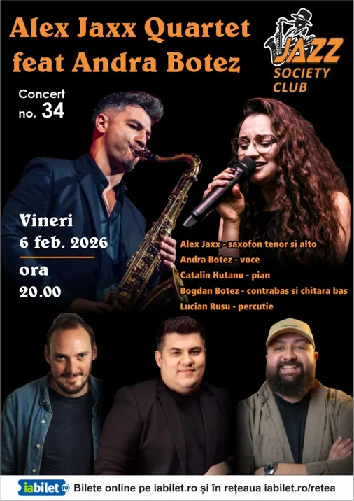 Jazz Society Club Galati continua seria evenimentelor sale de referinta cu un concert special sustinut de Alex Jaxx Quartet avand-o ca invitata pe Andra Botez. Proiectul reuneste muzicieni cu un discurs artistic modern si rafinat.