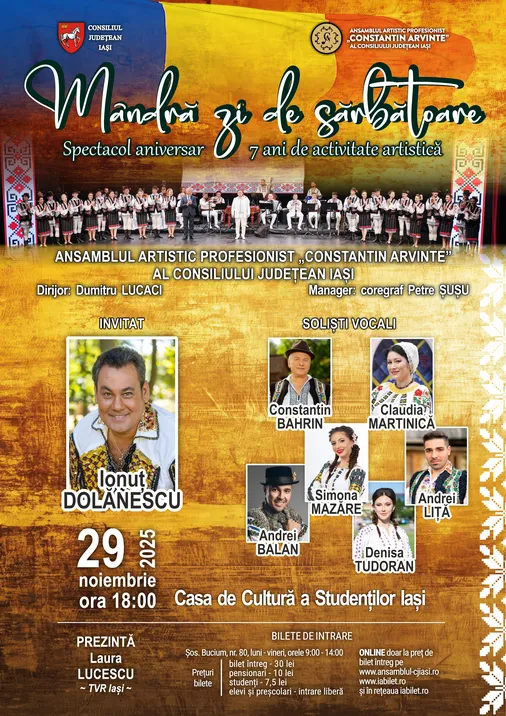După cum v-am obișnuit deja, Ansamblul Artistic Profesionist „Constantin Arvinte” al Consiliului Județean Iași aniversează în fiecare an, în preajma praznicului Sfântului Andrei, începutul activității sale artistice. Anul acesta vom marca împlinirea a 7 ani de la primul nostru spectacol, ani în care am crescut – credem noi – frumos, devenind cunoscuți în țară și peste hotare, Iașul folcloric fiind asociat astăzi și cu imaginea ansamblului ieșean.