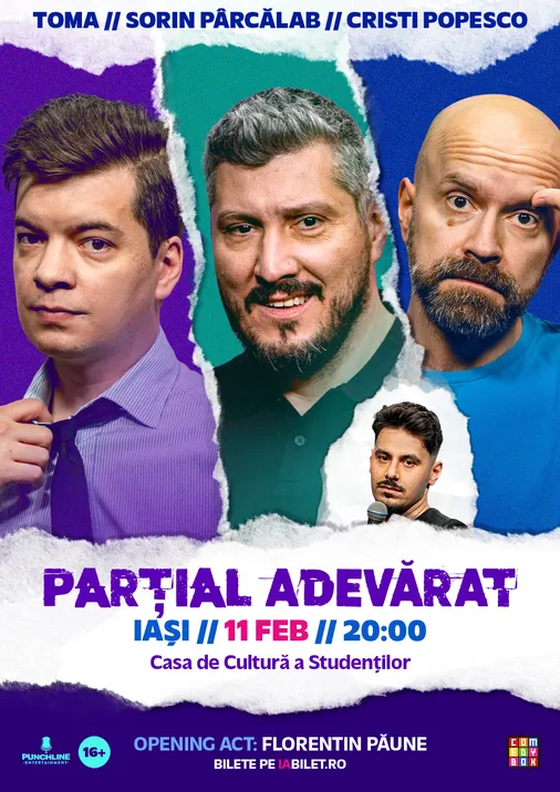 Îi știi de la televizor, de pe YouTube sau de la ComedyBox. I-ai văzut în Una Scurtă, Râzi că Prostu’ sau te-ai uitat la podcastul Ceva Mărunt, iar acum poți să-i vezi LIVE! Sorin Pârcălab, Cristi Popesco și Toma pleacă toamna asta în turneu cu material nou, glume noi și povești care te vor face să râzi în hohote! Hai să-i vezi și tu în cel mai nou show al lor: Parțial Adevărat! Locurile sunt limitate, așa că ia-ți biletele din timp și asigură-ți locul la cel mai așteptat show de Stand-up Comedy al toamnei!