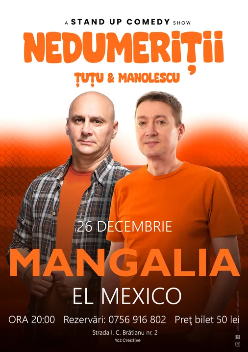 Mangalia, adună-ţi gaşca şi vino vineri, 26 decembrie, la restaurantul EL MEXICO, să îi vezi pe Cristi – ce mi-ai pus pe tăviţă, mamă – Manolescu şi Dan Ţuţu, un povestitor desăvârşit care te va cuceri cu naturaleţea sa. Cel mai bun mod de a petrece seara de joi, e cu o bere în faţă, la un show live de stand-up comedy