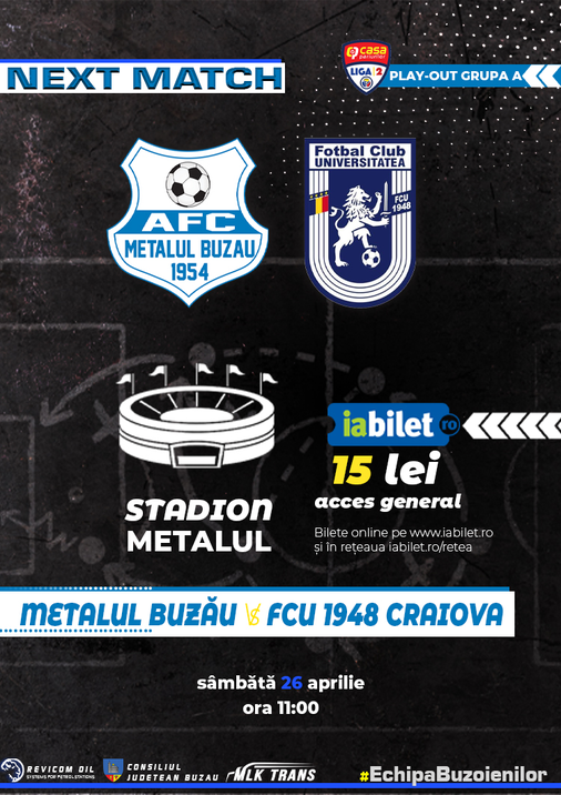 A fost un sezon minunat. Acum a venit momentul să ne luăm la revedere. Urmează ultimul meci de pe Stadion Metalul din anul competițional 2024-2025. Vă așteptăm în număr cât mai mare sâmbătă, 26 aprilie 2025, ora 11:00, pe Stadion Metalul, pentru a urmări partida Metalul Buzău – FCU 1948 Craiova, etapa 5 din Liga 2, Play-out Grupa A.