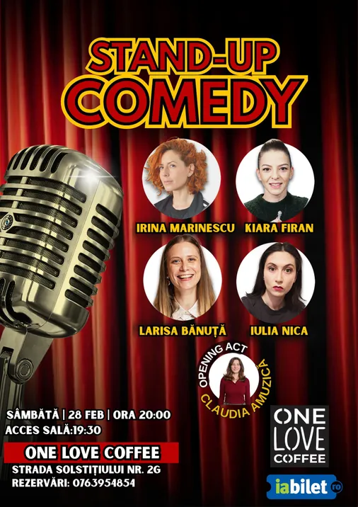 Irina Marinescu, Kiara Firan, Larisa Bănuță și Iulia Nica vin la One Love Coffee, Str. Solstițiului 2G, Popești-Leordeni, cu umor colorat, glume pe care nu le-ai mai auzit și multă caterincă. Show more details