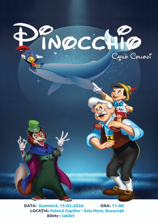 Va invităm și vă așteaptăm la o călătorie plină de peripeții și aventuri, puse într-un spectacol muzical cu actori, păpuși și mascote care îți vor spune o poveste cu tâlc - Pinocchio.