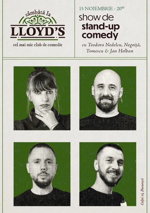 Sâmbătă, 15 noiembrie, ora 20:00, la Lloyd's Comedy Club dăm startul distracției de weekend alături de 5 comedianți care ne vor binedispune cu un Show de Stand-up Comedy plin de umor și energie